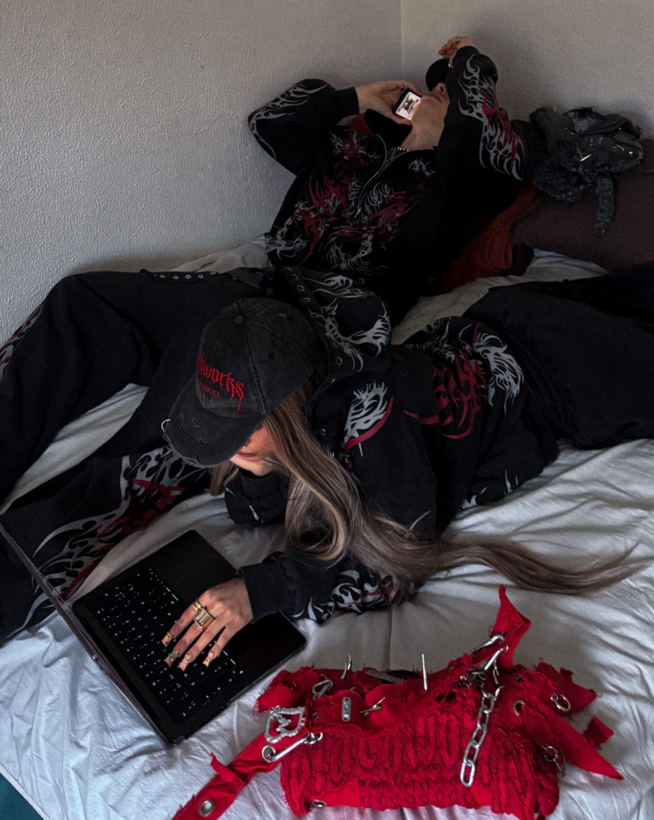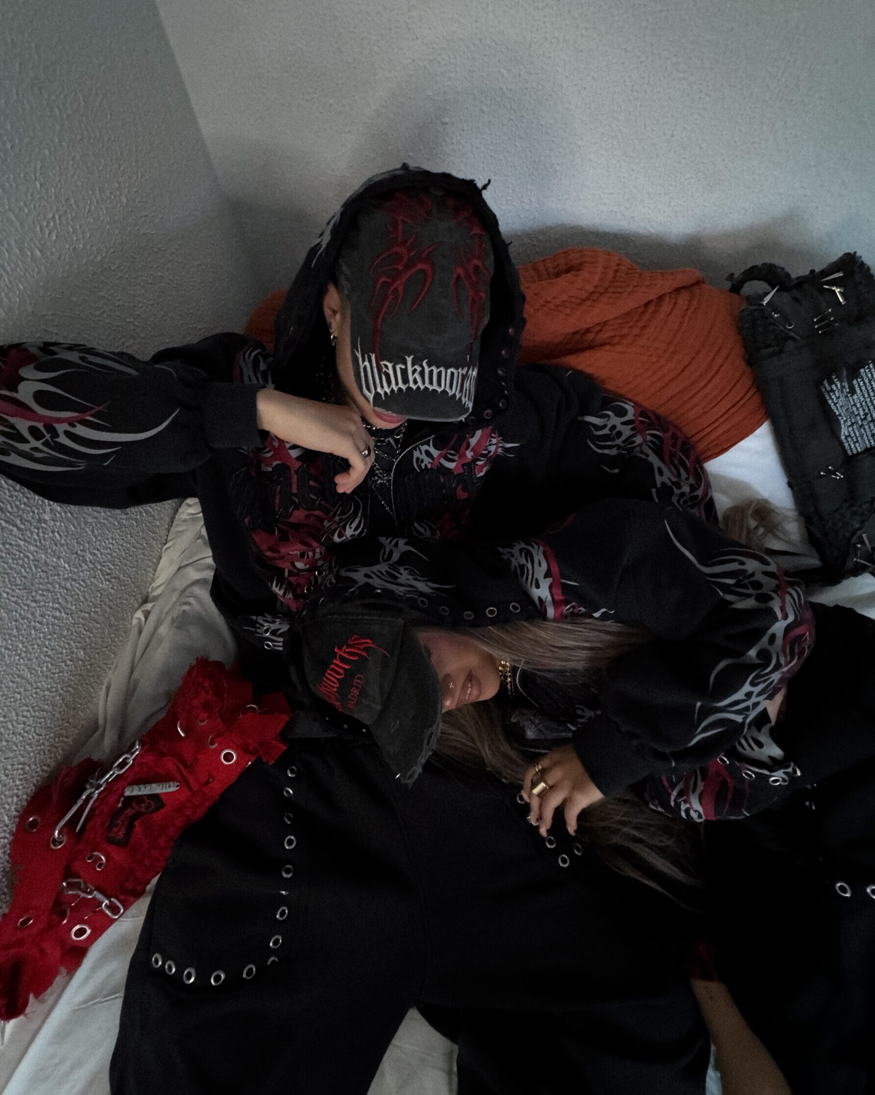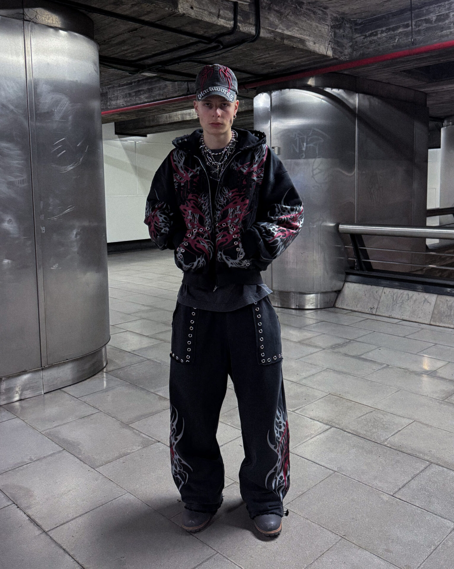 Zip hoodie with hood, metallic details, Blackworks front patch and screen-printed tribal graphics.