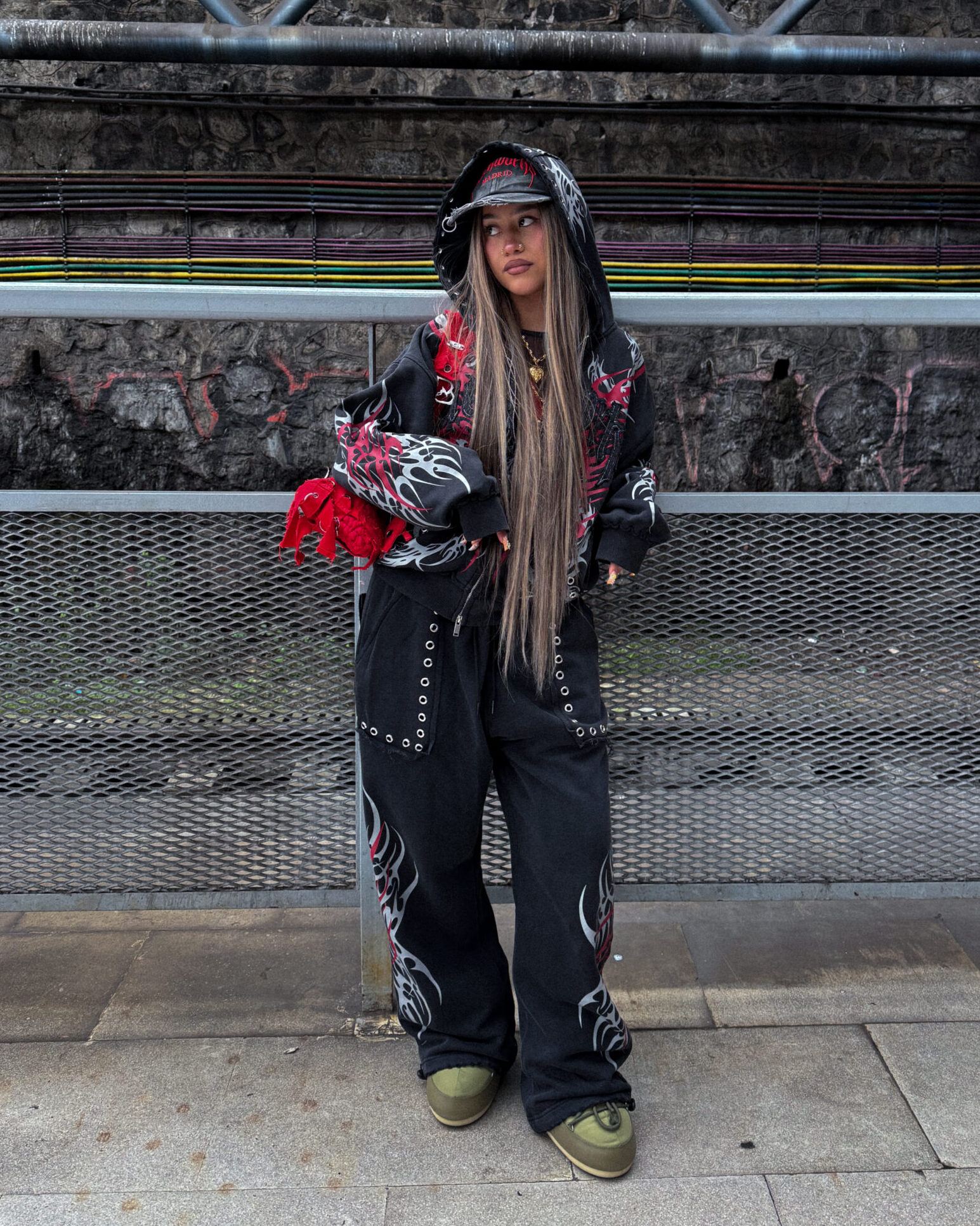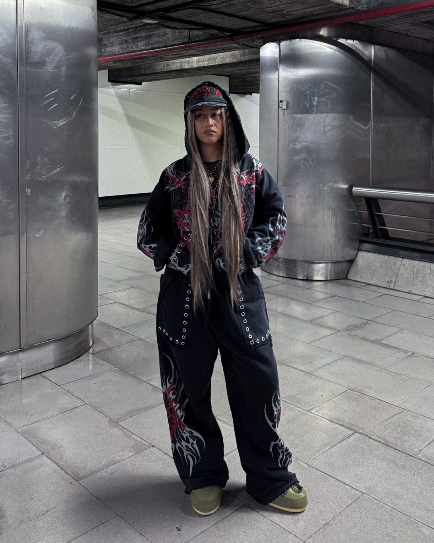 Matching pants in baggy oversized cut, metallic pocket details, embroidered back pocket and adjustable hems.